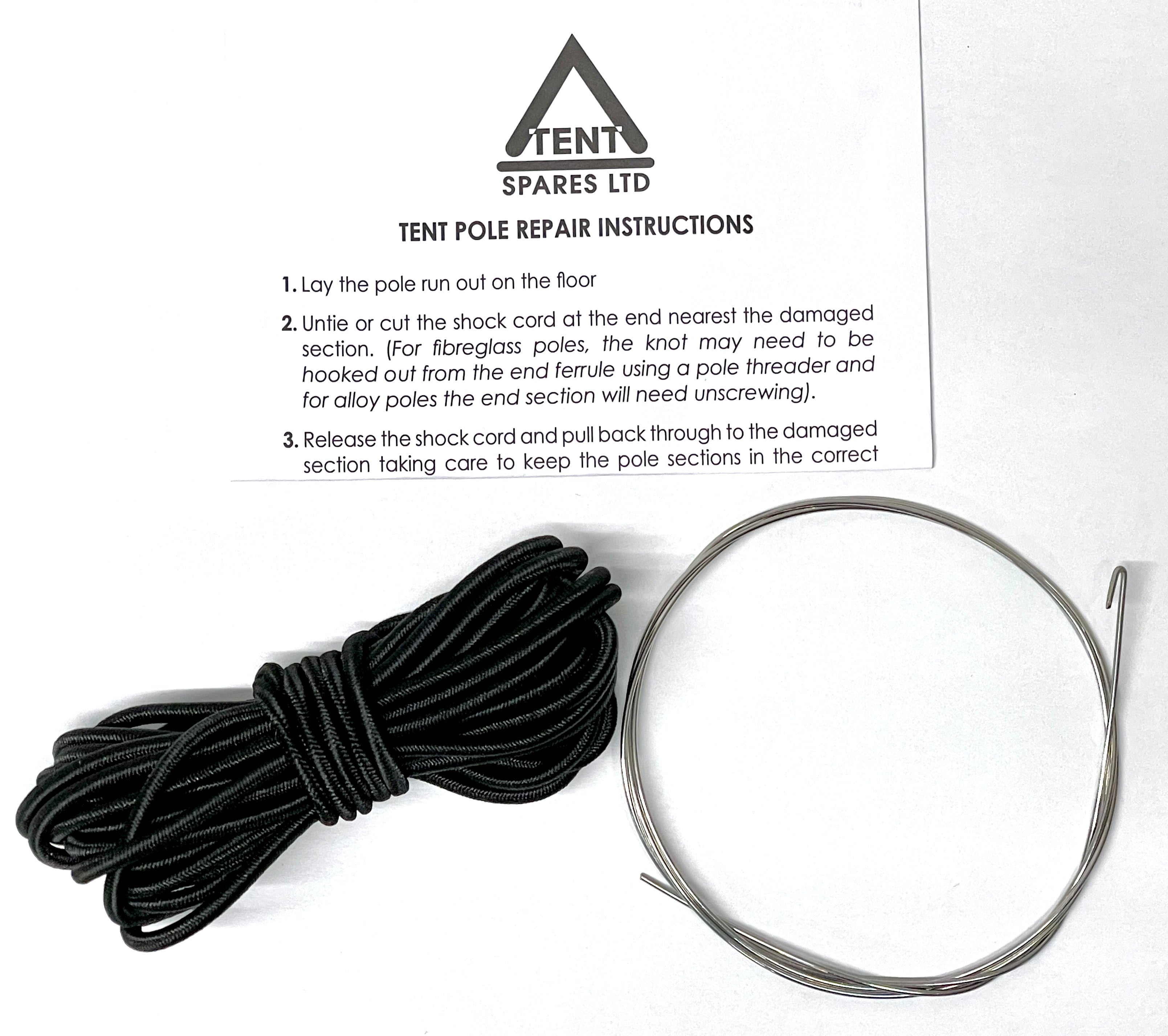 This kit includes a replacement tent pole elastic and a threading tool which are designed to help you re-string your damaged tent poles back together. The pole elastic is 4m long (approx.) and will stretch to roughly 7m.