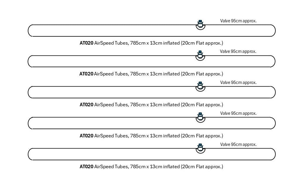 The Set Consists of: 5 x AT020 AirSpeed Tubes, 785cm x 13cm inflated (20cm Flat approx). The valve is 95cm approx from the end of the tube.