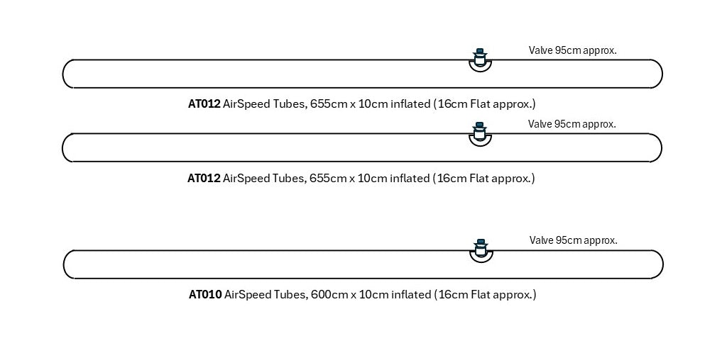 The Set Consists of: 2 x AT012 AirSpeed Tubes, 655cm x 10cm inflated (16cm Flat approx) & 1 x AT010 AirSpeed Tubes, 600cm x 10cm inflated (16cm Flat approx). The valve is 95cm approx from the end of the tube.