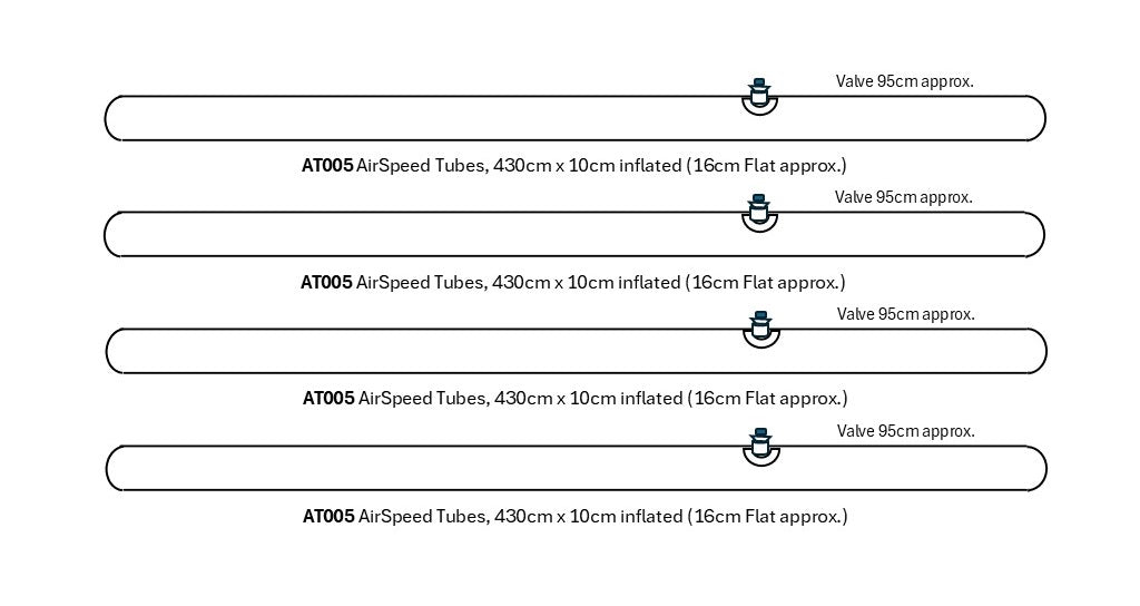 The Set Consists of: 4 x AT005 AirSpeed Tubes, 430cm x 10cm inflated (16cm Flat approx). The valve is 95cm approx from the end of the tube.