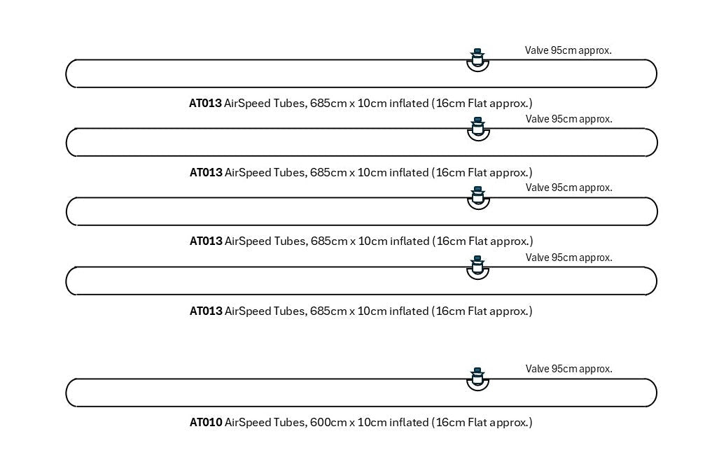 The Set Consists of: 4 x AT013 AirSpeed Tubes, 685cm x 10cm inflated (16cm Flat approx) & 1 x AT010 AirSpeed Tubes, 600cm x 10cm inflated (16cm Flat approx). The valve is 95cm approx from the end of the tube.