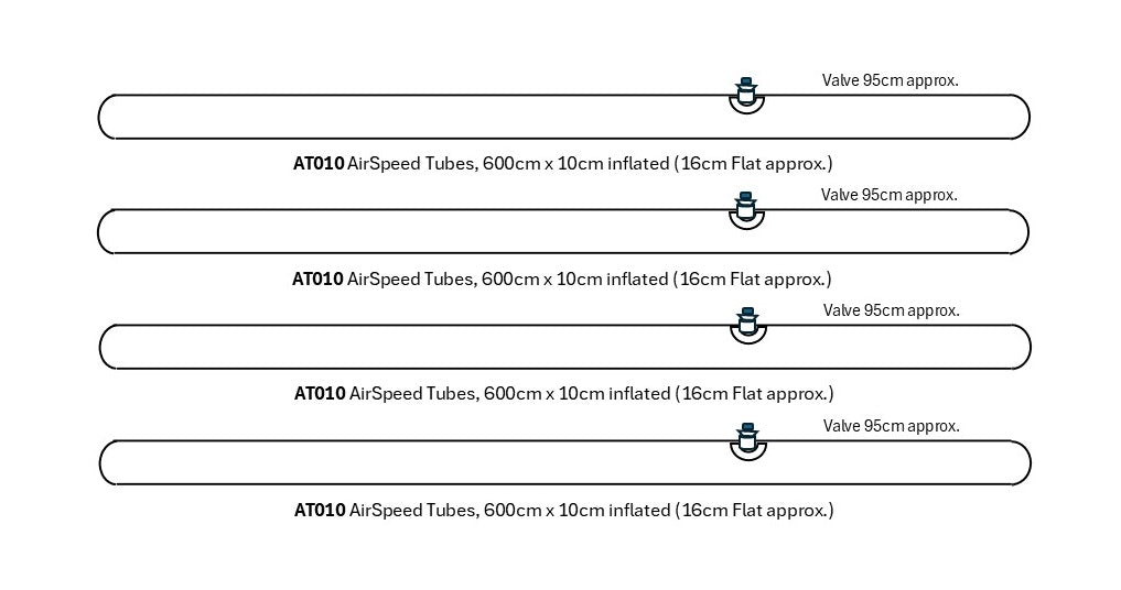The Set Consists of: 4 x AT010 AirSpeed Tubes, 600cm x 10cm inflated (16cm Flat approx). The valve is 95cm approx from the end of the tube.