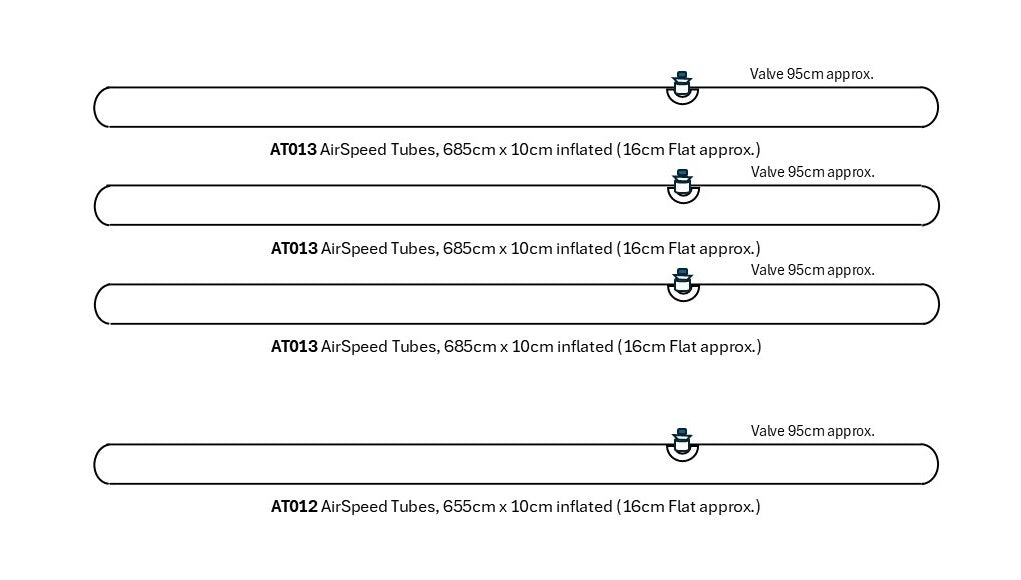 The Set Consists of: 3 x AT013 AirSpeed Tubes, 685cm x 10cm inflated (16cm Flat approx) & 1 x AT012 AirSpeed Tubes, 655cm x 10cm inflated (16cm Flat approx). The valve is 95cm approx from the end of the tube.