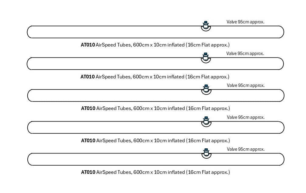The Set Consists of: 5 x AT010 AirSpeed Tubes, 600cm x 10cm inflated (16cm Flat approx). The valve is 95cm approx from the end of the tube.