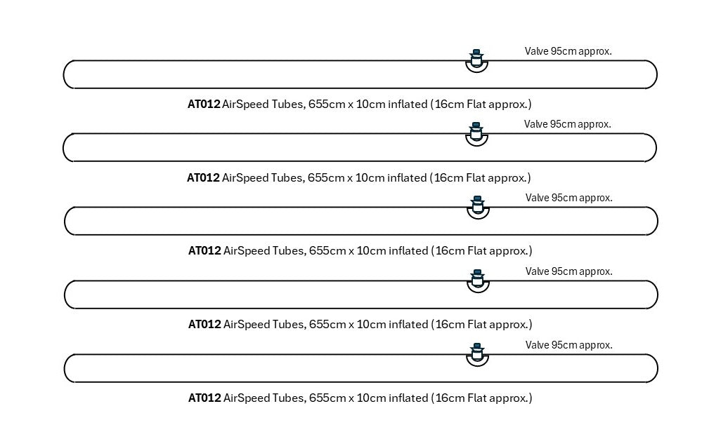 The Set Consists of: 5 x AT012 AirSpeed Tubes, 655cm x 10cm inflated (16cm Flat approx). The valve is 95cm approx from the end of the tube.