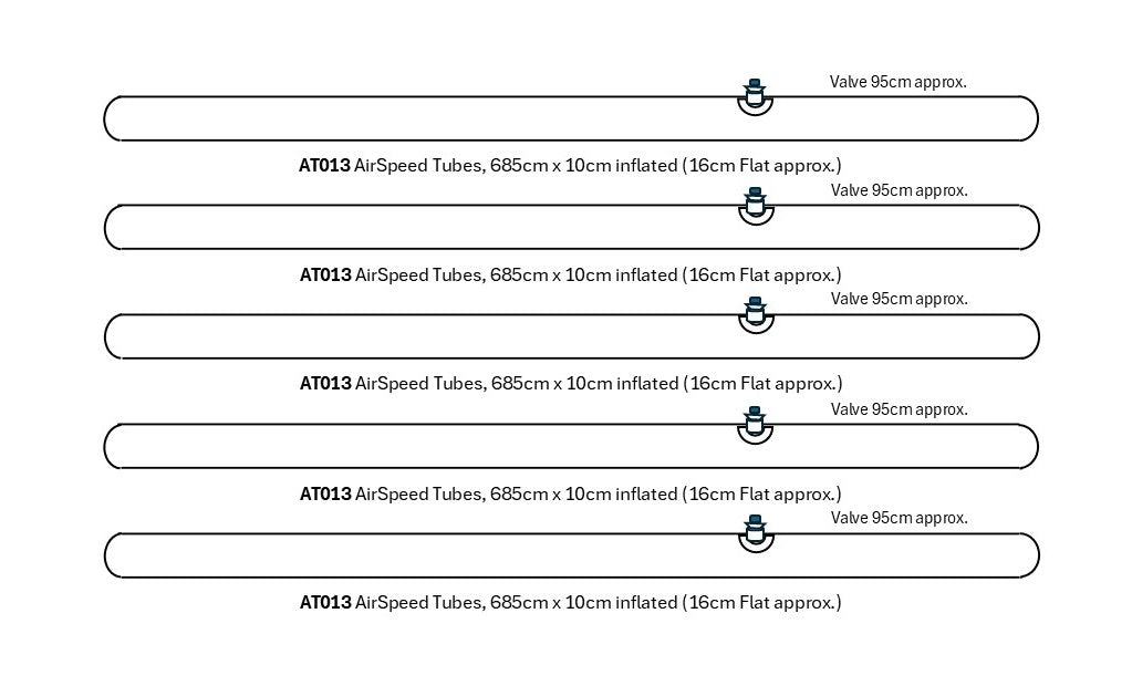 The Set Consists of: 5 x AT013 AirSpeed Tubes, 685cm x 10cm inflated (16cm Flat approx). The valve is 95cm approx from the end of the tube.