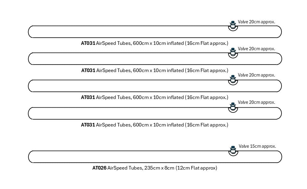 The Set Consists of: 4 x AT031 AirSpeed Tubes, 600cm x 10cm inflated (16cm Flat approx), the valve is 20cm approx from the end of the tube & 1 x AT026 AirSpeed Tubes, 235cm x 8cm (12cm Flat approx), the valve is 15cm approx from the end of the tube.