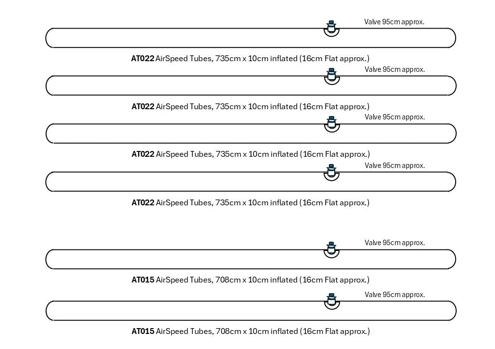 The Set Consists of: 4 x AT022 AirSpeed Tubes, 735cm x 10cm inflated (16cm Flat approx) & 2 x AT015 AirSpeed Tubes, 708cm x 10cm inflated (16cm Flat approx). The valve is 95cm approx from the end of the tube.