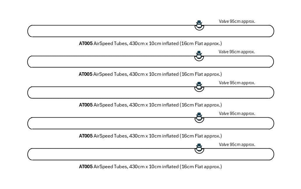 The Set Consists of: 5 x AT005 AirSpeed Tubes, 430cm x 10cm inflated (16cm Flat approx). The valve is 95cm approx from the end of the tube.